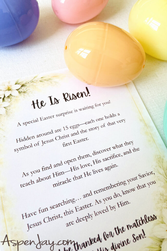 The Easter printable includes two pages: one with 12 eggs, and another with three eggs and the “He is Risen” instruction page. They fit perfectly in jumbo plastic eggs, but you could also roll them up to fit into the smaller eggs if needed. Feel free to print as many copies as you need to spread the joy of the season to others!
